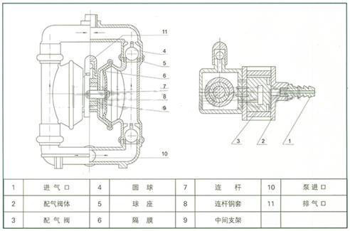 1、QBY氣動隔膜泵的兩個對稱各種腔中,各裝有一塊有彈性的隔膜6,聯桿7將兩塊隔膜結成一體,壓縮空氣從泵的進氣接頭1進入配氣閥3后,推動兩個工作腔內的隔膜,驅使聯桿聯接的兩塊隔膜同步運動。與此同時,另一工作腔中的氣體則從其隔膜的背后排出泵外;一旦到達行程終點,配氣機構則自動地將壓縮空氣引入另一工作腔,推動隔膜朝相反方向運動,這樣就形成了兩個隔膜的同步往復運動。每個工作腔中又設置有兩個單向球閥4,隔膜的往復運動,造成工作腔內容積的改變,迫使兩個單向球閥交替地開啟和關閉,從而將液體連續地吸入和排出。