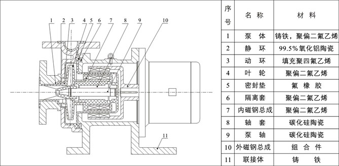 驅(qū)動裝置采用主動磁鐵聯(lián)軸器直接裝在電機軸上,泵室完全封閉,通過磁力偶合間接驅(qū)動泵軸上帶磁鐵的葉輪旋轉(zhuǎn)結(jié)構(gòu)緊湊、安全節(jié)能。堅固耐用的泵體結(jié)構(gòu)雖然接觸液體部分是氟塑料,但泵外殼是金屬材料,故泵體足以承受管道的重量及抵受機械性沖擊,氟塑料磁力泵由泵、磁力傳動器、電動機三部分組成。關(guān)鍵部件磁力傳動器由外磁轉(zhuǎn)子、內(nèi)磁轉(zhuǎn)子及不導磁的隔離套組成。當電動機帶動外磁轉(zhuǎn)子旋轉(zhuǎn)時,磁場能穿透空氣隙和非磁性物質(zhì),帶動與葉輪相連的內(nèi)磁轉(zhuǎn)子作同步旋轉(zhuǎn),實現(xiàn)動力的無接觸傳遞,將動密封轉(zhuǎn)化為靜密封。由于泵軸、內(nèi)磁轉(zhuǎn)子被泵體、隔離套完全封閉,從而徹底解決了“跑、冒、滴、漏”問題,消除了煉油化工行業(yè)易燃、易爆、有毒、有害介質(zhì)通過泵密封泄漏的安全隱患,有力地保證了職工的身心健康和安全生產(chǎn)。